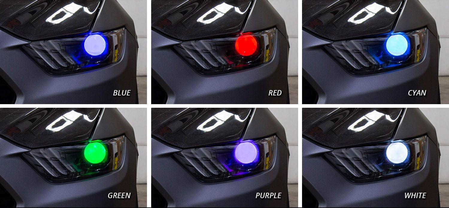 Full RGBW. Full multicolor, with no sacrifice. Convert the projector inside your Mustang's headlights to illuminate in any color for a unique, custom look. This kit adds an LED to shine light onto the projector lens. Unlike other RGB Demon Eyes on the market that produce a mixed white color, our Pro Series Demon Eyes are RGBW, with independent White LEDs. After you have fun with colors, just select True White for a crisp, clean white output for everyday use.